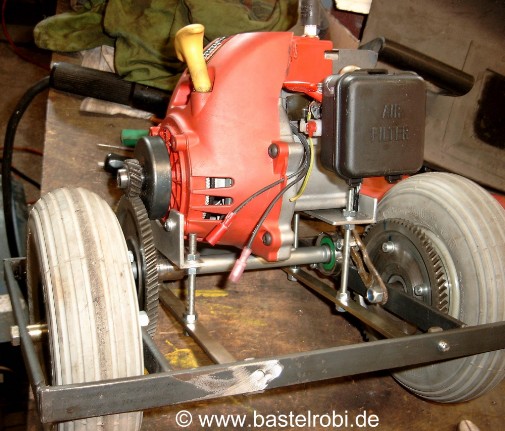 Das Ding geht gut ab und die Fliehkraftkupplung kommt mit der Untersetzung auch gut klar. Bedingt durch die offenen Untersetzungen ist der Antrieb recht Laut. Dafür sind aber alle Teile preiswert aus der Grabbelkiste bzw. vom Schrott.