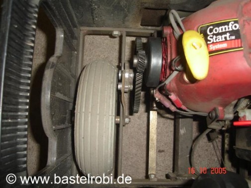 Je 15x69 Zähne, macht eine Gesamtuntersetzung von 1:21. An die Felge des rechten Hinterrades habe ich einen Aluscheibe montiert die dann das Zahnrad für den Antrieb trägt.
