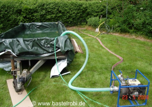 Das Spülwasser (ca. 2,4 m³) haben wir in einem mit Siloplane ausgelegtem PKW Anhänger gespeichert. Von dort aus saugte es die Motorpumpe an und drückte es durch die C-Schläuche zur Spüllanze. Diese bestand aus 1,5m Rohrstücken die mit Muffen einfach locker per Hand verschraubt wurden. Das brauchte ja nicht super dicht sein. Das durch das Bohrloch zurückfließende Spülwasser wurde in einem umgedrehten Sandkasten, der auch mit Plane ausgekleidet wurde, aufgefangen. Von dort aus förderten 2 Tauchpumpen das Wasser zurück in den Anhänger. Da die Förderleistung der Motorpumpe wesentlich höher war als die Rückpumpleistung der beiden Tauchpumpen mussten immer wieder ungewollte Pausen eingelegt werden. Also wieder warten bis genug Spülwasser im Hänger ist. In diesen Pausen ist uns dann immer das frisch gespülte Loch wieder zusammen gesackt und die Spüllanze saß fest. Heute weiss ich das die Zugabe von Betonit in das Spülwasser das zusammensacken verhindert hätte...