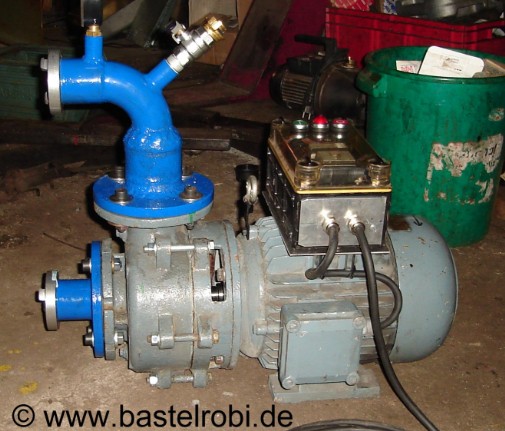 Als Fan des „roten Steckers“ habe ich mir eine ordentliche 400V 5,5KW Drehstrompumpe besorgt. Die stemmt mit max. 50m³/h ca. 13,8L/Sec. bei 3bar! Die C-Schläuche sind eigentlich zu klein. Pumpe wurde zerlegt, gereinigt, neu gelagert, Gleitringdichtung erneuert und 2 Anschlussflansche mit Storz-C angefertigt. Auf dem Motor fand noch ein recycelter Schaltkasten mit Hauptschütz und ein Drehfeldüberwachung platz. Das Bierchen mal zum Größenvergleich... Fetter Brummer!!!!