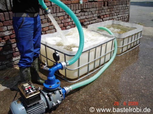 Wir haben eine leistungsstarke 2kW-Kreiselpumpe mit max. 160 l/min (9600l/h) mit ¾-Zoll Schlauch zum "Power-Wässern".