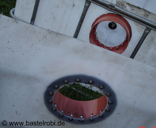 Als Spülwassertank habe ich einen 1000L IBC-Tank halbiert und beide über angeschraubte, modifizierte 150er KG-Rohr Endkappen und einer Überschiebmuffe verbunden. Es blieben 130mm Durchmesser als Durchflussöffnung übrig. Da sich die 150er Muffe nach dem Einsatz nur sehr wiederwillg demontieren ließ, ist im ersten Schritt eine M12 Gewindestange quer durchgeschraub worden. Später habe die die Muffe einfach mit der Stichsäge einmal längst aufgesägt und mit Spannverschlüsse wieder klemmbar gemacht. Im Einsatzfall wird der Schlitz nach oben gedreht und ergibt sich kein Nachteil oder Undichtigkeit.