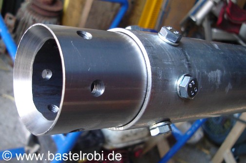 Da es keinen Bohrmast gab durfte das Spülgestänge nicht zu schwer werden. Daher wurden 3 Stangen 6m Alurohr 50x2mm bestellt, die etwa dem 2 Zoll C-Rohr Durchmesser entsprechen. Mit diesen Längen gewinnt man auch schnell Tiefe ohne sich mit kleinen Rohrstücken abzumühen. Als Verbindungselemente habe ich Hülsen gedreht die radial mit dem Alurohr verschraubt wurden. Diese Art der Verbindung hat sich aber als nicht praktikabel herausgestellt. Nur etwas Sand dazwischen und es passt nicht oder klemmt. Als nächste Verbesserung werde ich hier auf Verschraubungen mit Überwurfmuttern wechseln.