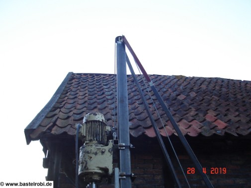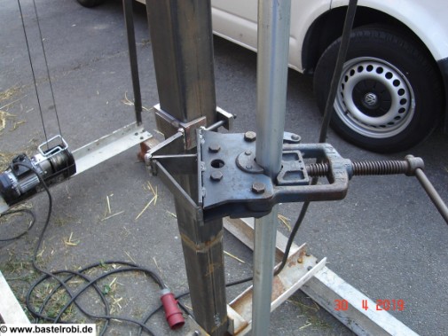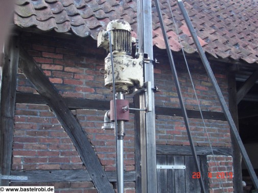 Also habe ich doch einen Bohrturm mit Motor, Winde und Spülkopf gebaut. Der Motor hat ca. 3m Verfahrweg sodass 2m Bohrstangen aufgenommen werden können.