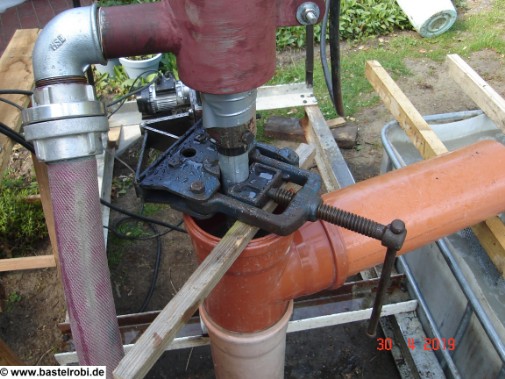 eine 150er KG-Rohr mit T-Stück zur Rückführung des Spülwassers eingesetzt und