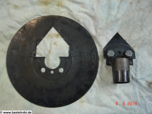 Also habe ich, wie hier im Bild links zu sehen, eine Bohrspitze aus HSS-Stahl gebaut. Verschweißen dieses Materials war mir zu unsicher (bricht) sodass ich aus einem Sägeblatt eine Metallkreissäge genau das Stück mit Bohrung ausschnitt was ich benötigte.