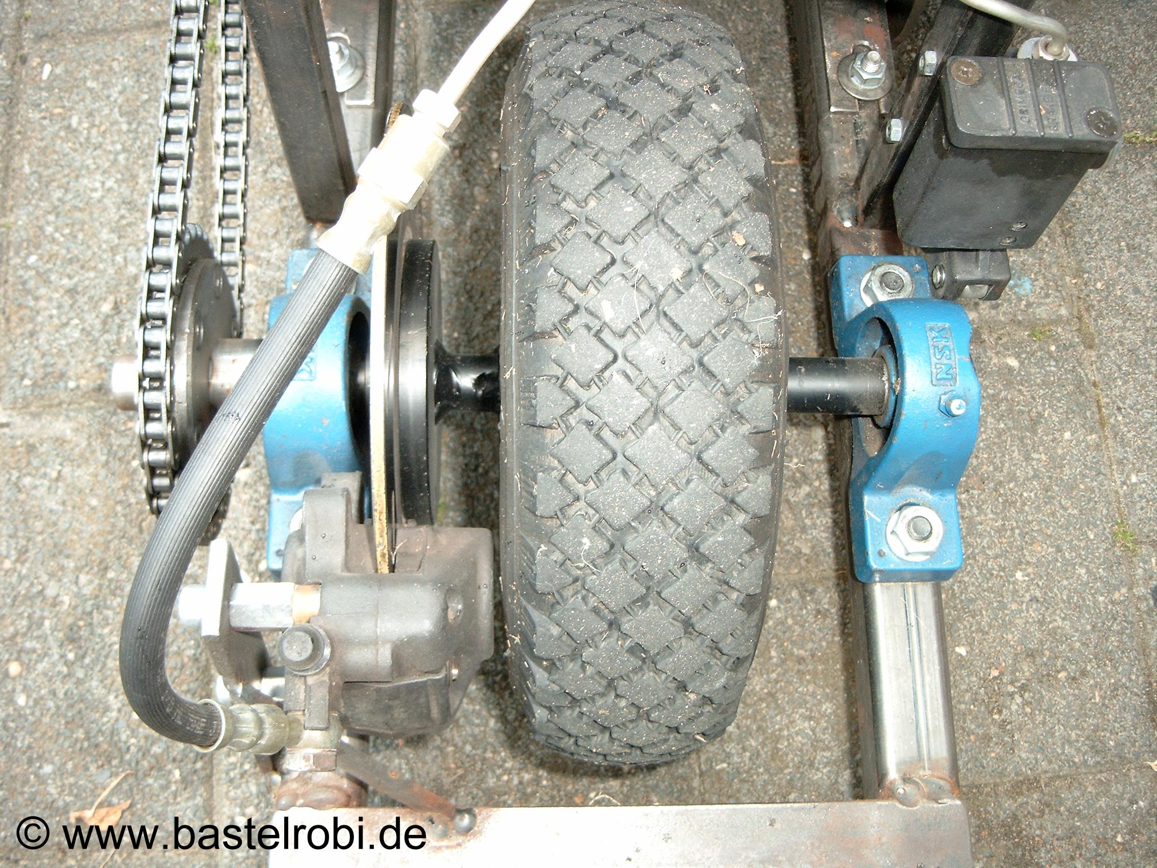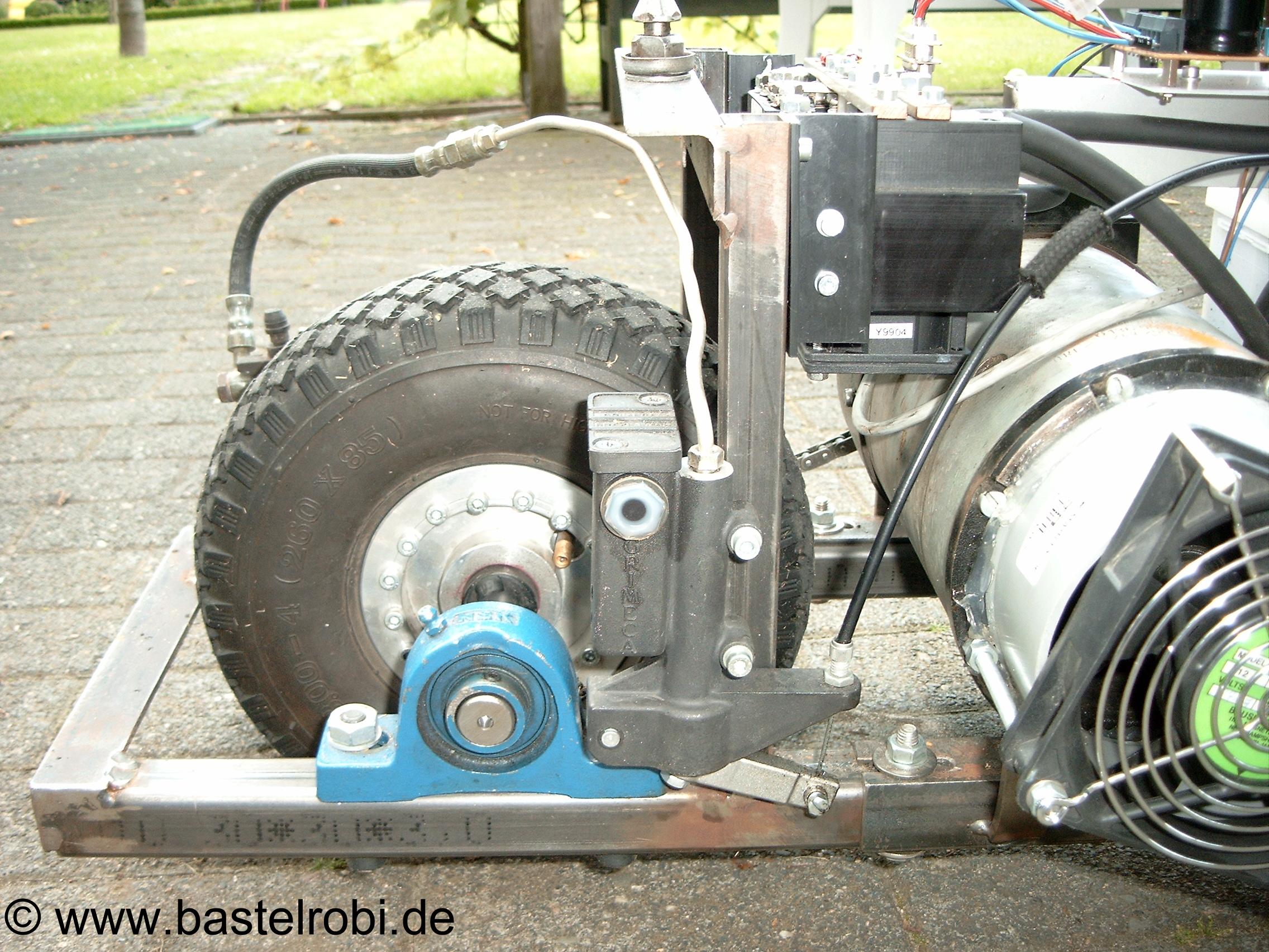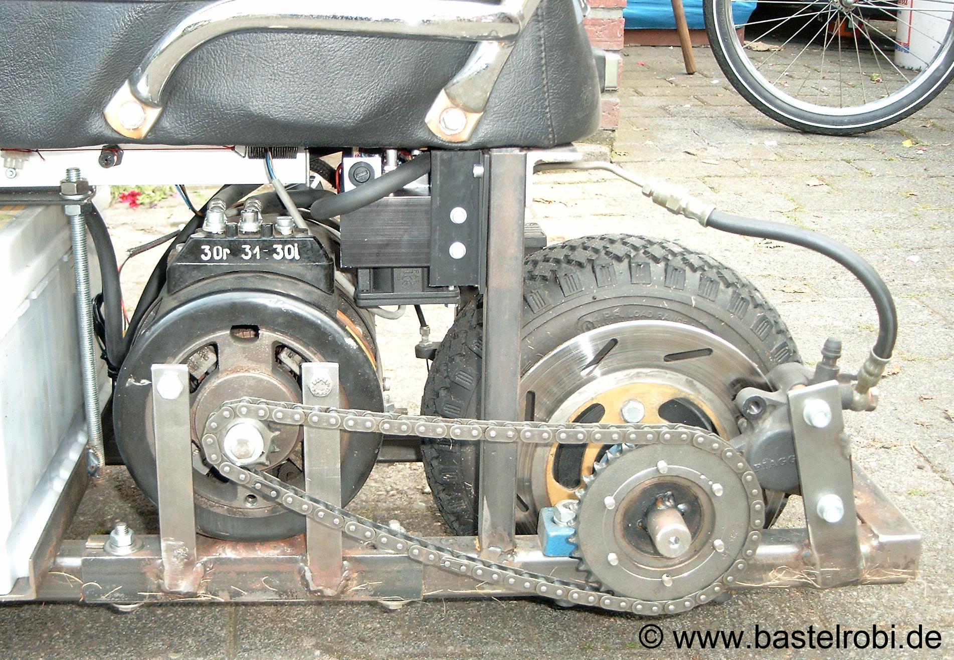 Angetrieben von einen Bosch-Motor (Reihenschluss-Gleichstrom) aus einem Gabelstapler! Dieser wiegt allein 20kg, leistet bei 24V 2000Watt (fast 3PS) und erzeugt einen Nennstrom von ca. 90A. Der Spitzen-Beschleunigungs-Strom liegt auch schon mal schnell über 200A!!!