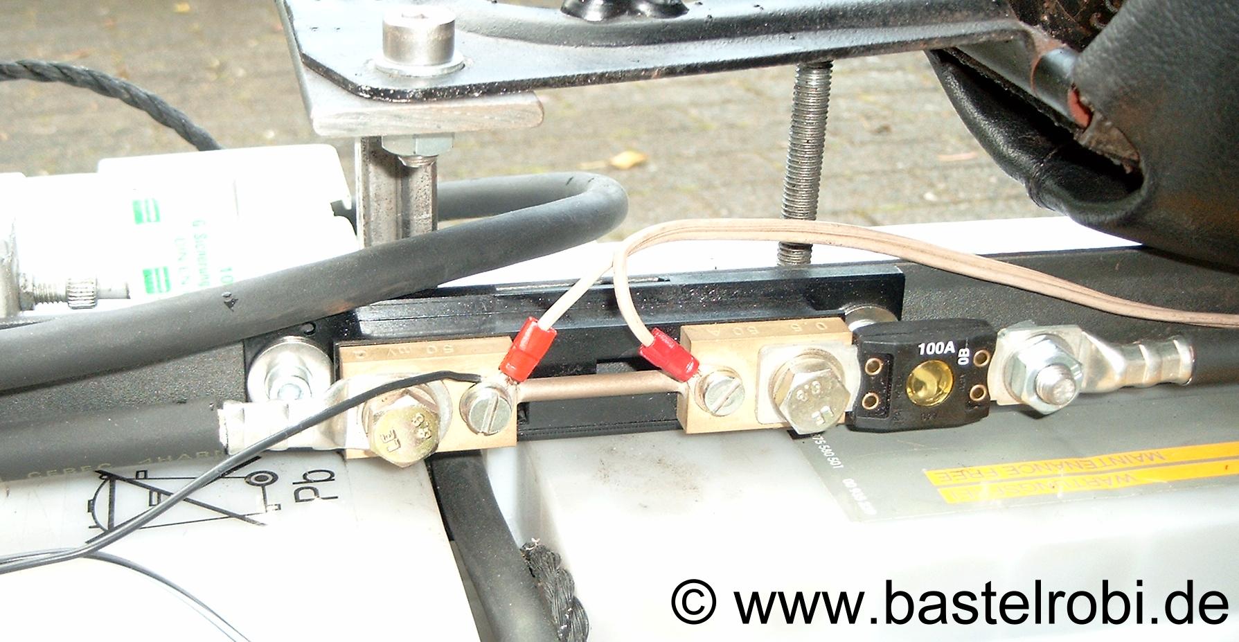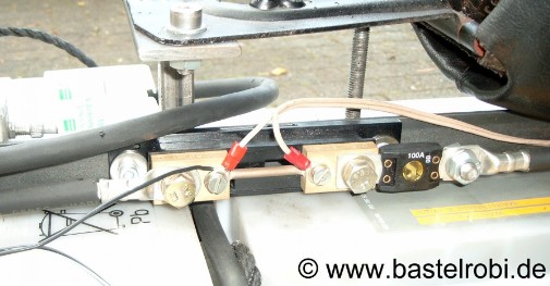Nach dem Hauptschalter sitzt eine 100A Sicherung und dann ein Shunt zur Messung des Stroms. Der so gewonnene Messwert wird am vorne angebrachten Amperemeter bis 199,9A angezeigt.