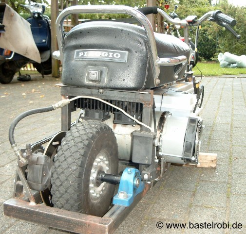 48km/h schnell, scheibengebremst, 2-teilige Alufelge hinten, mit Sackkarrenrädern 260x85mm und 2 fetten 88Ah Starterbatterien. - und ohne TÜV:-(
