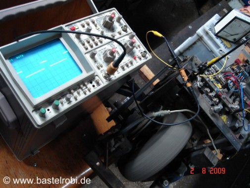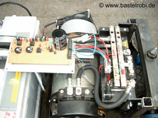 Bei diesen großen Strömen kommt, wie auch im Stapler, nur eine Impuls-Breiten-Steuerung (PWM) in Frage. Diese "pulst" in einer hohen Frequenz mit veränderbarer Impulsdauer die volle Batteriespannung auf den Motor. Das aber immer nur für ein Bruchteil einer Sekunde. Je nach Verhältnis der Einschaltzeit zur Ausschaltzeit dreht der Motor dann schneller oder langsamer bis hin zur Höchstdrehzahl bei 100% Einschaltzeit. So lässt sich eine sehr feinfühlige Steuerung realisieren.