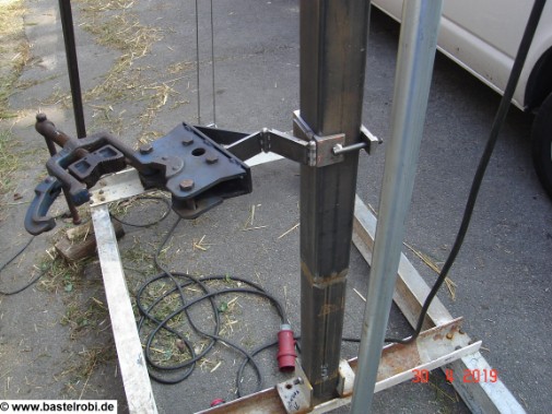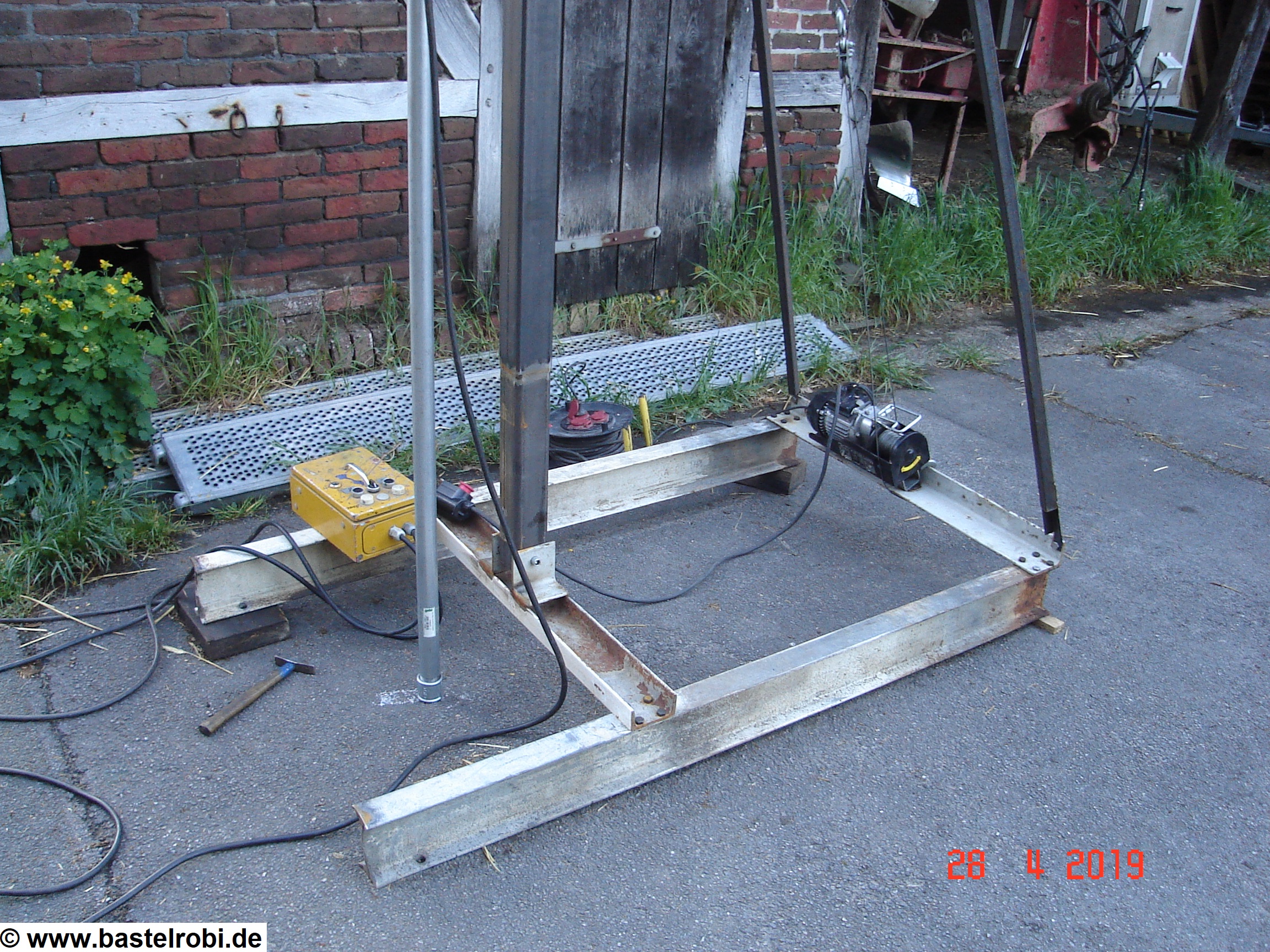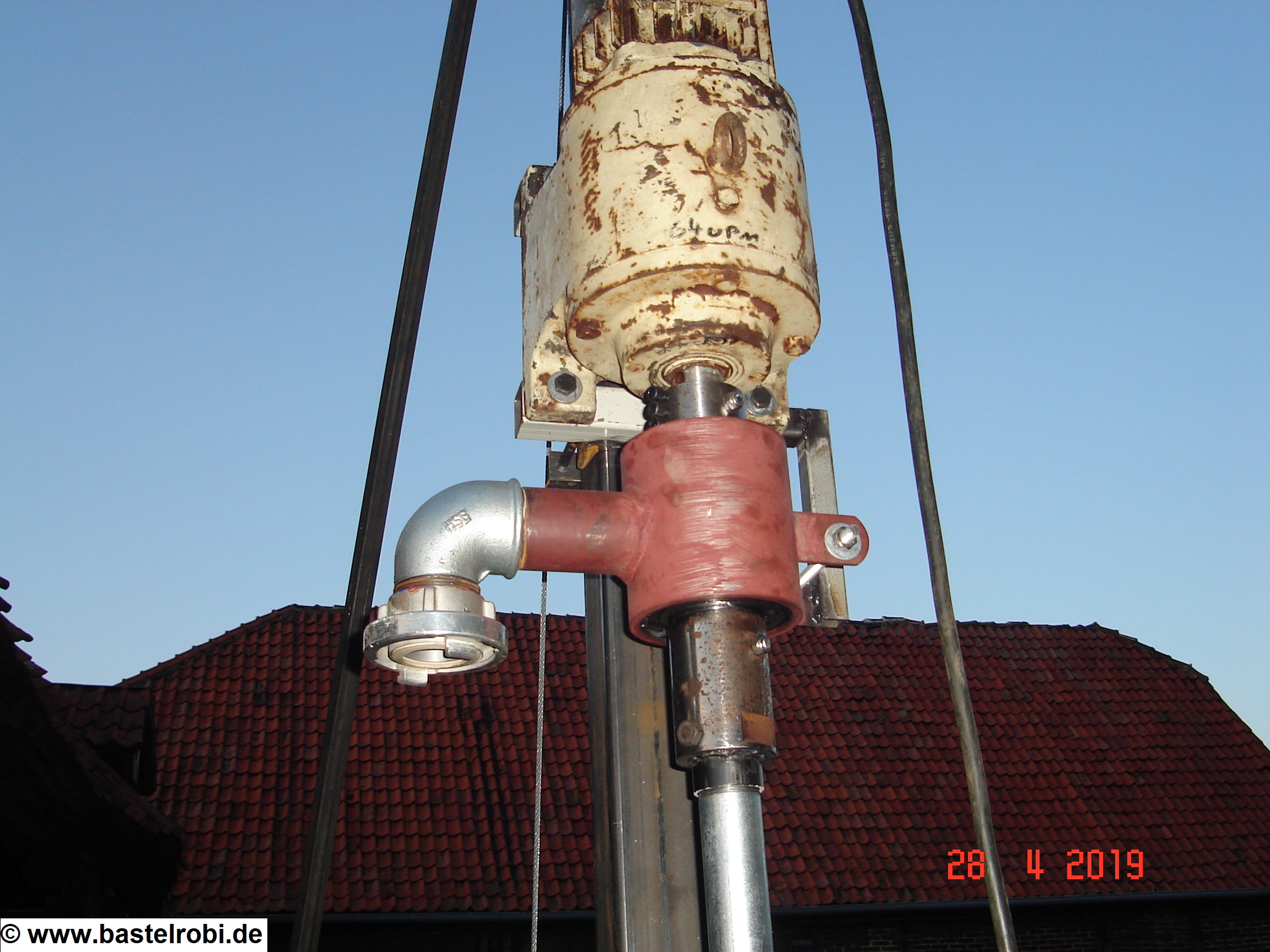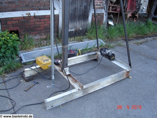 Also habe ich doch einen Bohrturm mit Motor, Winde und Spülkopf gebaut. Der Motor hat ca. 3m Verfahrweg sodass 2m Bohrstangen aufgenommen werden können.