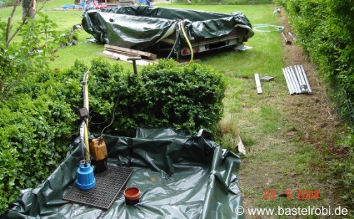 Das Spülwasser (ca. 2,4 m³) haben wir in einem mit Siloplane ausgelegtem PKW Anhänger gespeichert. Von dort aus saugte es die Motorpumpe an und drückte es durch die C-Schläuche zur Spüllanze. Diese bestand aus 1,5m Rohrstücken die mit Muffen einfach locker per Hand verschraubt wurden. Das brauchte ja nicht super dicht sein. Das durch das Bohrloch zurückfließende Spülwasser wurde in einem umgedrehten Sandkasten, der auch mit Plane ausgekleidet wurde, aufgefangen. Von dort aus förderten 2 Tauchpumpen das Wasser zurück in den Anhänger. Da die Förderleistung der Motorpumpe wesentlich höher war als die Rückpumpleistung der beiden Tauchpumpen mussten immer wieder ungewollte Pausen eingelegt werden. Also wieder warten bis genug Spülwasser im Hänger ist. In diesen Pausen ist uns dann immer das frisch gespülte Loch wieder zusammen gesackt und die Spüllanze saß fest. Heute weiss ich das die Zugabe von Betonit in das Spülwasser das zusammensacken verhindert hätte...