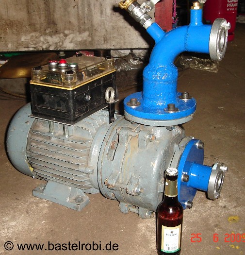 Als Fan des „roten Steckers“ habe ich mir eine ordentliche 400V 5,5KW Drehstrompumpe besorgt. Die stemmt mit max. 50m³/h ca. 13,8L/Sec. bei 3bar! Die C-Schläuche sind eigentlich zu klein. Pumpe wurde zerlegt, gereinigt, neu gelagert, Gleitringdichtung erneuert und 2 Anschlussflansche mit Storz-C angefertigt. Auf dem Motor fand noch ein recycelter Schaltkasten mit Hauptschütz und ein Drehfeldüberwachung platz. Das Bierchen mal zum Größenvergleich... Fetter Brummer!!!!