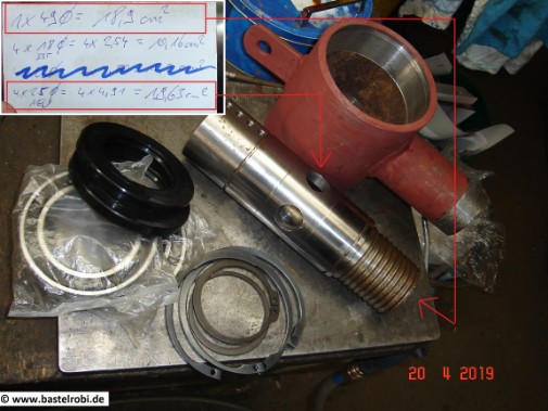Den hier abgebildeten 2 Zoll Spülkopf habe ich nicht selber gebaut sondern über eBay gekauft. Er besteht aus einem Gehäuse mit 2 großen Kugellagern und 2 Wellendichtringen um das die Lager vor dem Spülwasser zu schützen. Mit diesem Spülkopf ist es möglich in das sich drehenden Bohrgestänge Wasser zu übertragen. Die vier Löcher in der Hülse waren original nur in 18mm ausgeführt. Was zu einer Halbierung des Strömungsquerschnitts führte. Das würde zu Verringerung des Spülwasserdurchflusses und nachfolgend zu einem Druckabfall führen. Daher habe ich die Bohrungen auf 25mm aufgebohrt und erreiche so wieder den Innenquerschnitts des Anschlussgewindes.