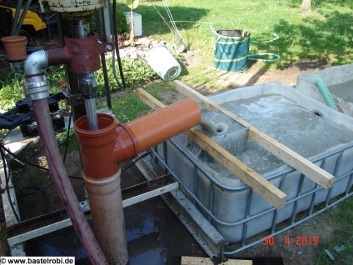 Dann eine Kreiselpumpe vom Trödelmarkt angeschlossen und Brunnen klarspülen. Nach ca. 45min. Dauerpumpen war das Grundwasser super klar und frei von Schwebestoffen. Diese Pumpe entnahm dem Brunnen 1000L pro Stunde ohne das er "trocken lief" oder Lufteinschlüsse im Wasser waren.