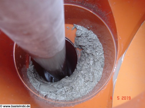 Das 150er KG-Rohr hat den Nachteil dass die Strömungsgeschwindigkeit des rückfließenden Spülwassers langsamer ist als in der Bohrung selber. Das bedeutet dass die durch die Bohrung gelösten Sedimente aus der Tiefe mit dem Spülwasser hochgespült werden aber innerhalb des 150er Rohres wieder absinken. Bei Entnahme des Bohrgestänges fiel der Dreck wieder in das Bohrloch.
